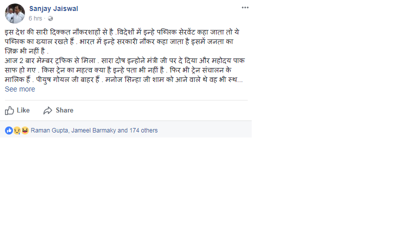 रेलवे की कार्यप्रणाली से नाराज सांसद संजय जायसवाल ने गुस्से में फेसबुक पर पोस्ट लिखी थी, पोस्ट में उन्होंने कहा था के- ”रेल को अफसरशाही नष्ट करने पर तुली हुई है. रेल दुर्घटना न हो इसलिए लाइन ठीक करने के नाम पर सभी ट्रेनें लेट चलने लगीं. जैसे इतना काफी नहीं था, अब अचानक सूचना मिली कि तीन दिसंबर से सत्याग्रह एक्सप्रेस को कैंसिल किया जा रहा है. जो कभी रेल में यात्रा ही नहीं किए वे सब अब रेल के मालिक हैं. जब मैंने डीआरएम को फोन किया तो वे कहते हैं कि उन्हें भी यह सूचना अखबार से मिली है.”