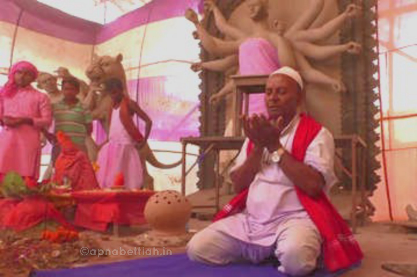 ये हैं अरमानी खान. पांचों पहर नमाज अता करते हैं. आजकल दशहरा को लेकर मां दु्र्गा की आराधना में जुटे हैं. फलाहार कर नवरात्र का व्रत रखने वाले इस मुसलमान के दिल में हिन्दुओं के पर्व के प्रति भी उतनी ही आस्था और श्रद्धा है. घर छोड़कर माता का मंडप ही इनका आशियाना है. यहीं पर मां की आराधना भी करते हैं और यहीं पर नमाज भी. अरमानी खान की भक्ति के कारण बगहा के नवदुर्गा पूजा समिति ने इन्हें अध्यक्ष की जिम्मेवारी सौंप दी है।