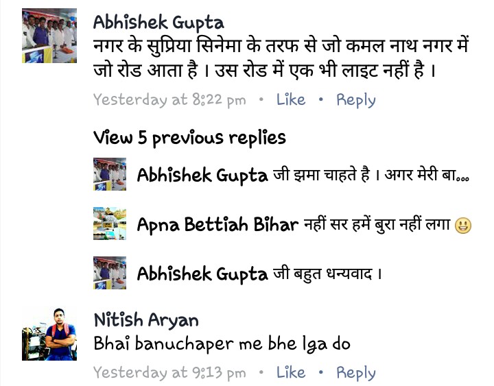 जैसा की उनलोगों ने बताया की बेतिया के विभिन्न जगहों जैसे- टाउन थाना रोड, कमलनाथ नगर रोड,बानुछापर और भी बहुत जगहों पर स्ट्रीट लाइट नहीं लगी है और वहा पर स्ट्रीट लाइट लगाना बहुत जरुरी है। ताकि बेतिया के लोगो को रात में कोई परेशानी न हो।