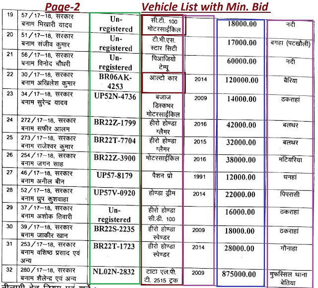 जिसे सार्वजनिक नीलामी द्वारा बिक्री की जा रही है। 1 दिसंबर को नीलामी नहीं होने पर 4 एवं 5 दिसंबरको नीलामी की जायेगी। नीलाम होने वाले वाहनों में टाटा एलपीटी 2515 ट्रक, आल्टो कार, बोलेरो, पिआजियो टेम्पू, हुण्डई इयोन एरा कार, महेन्द्र 265 डीएल ट्रैक्टर टे्रलर, हीरो होण्डा स्पलेंडर, पैशन प्रो, हीरो ग्लैमर, हीरो स्पलेंडर प्लस, डिस्कवर मोटरसाइकिल, सीडी डिलक्स, सीटी 100, टीभीएस स्टार सिटी, बजाज डिस्कवर शामिल हैं।